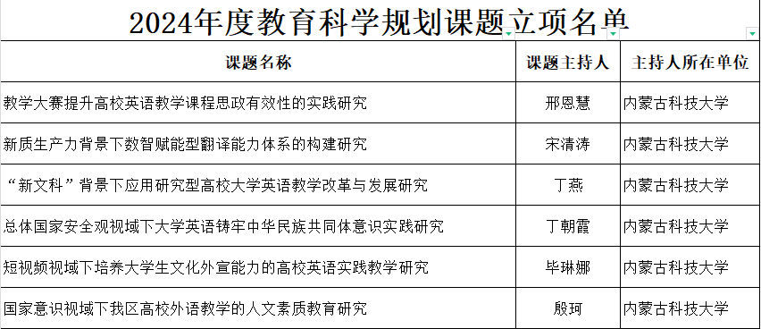 近日,2024年度自治区教育科学规划课题在自治区教育厅官网公示,公司教师邢恩慧、宋清涛、丁燕、丁朝霞、毕琳娜、殷珂获批立项,特此祝贺!