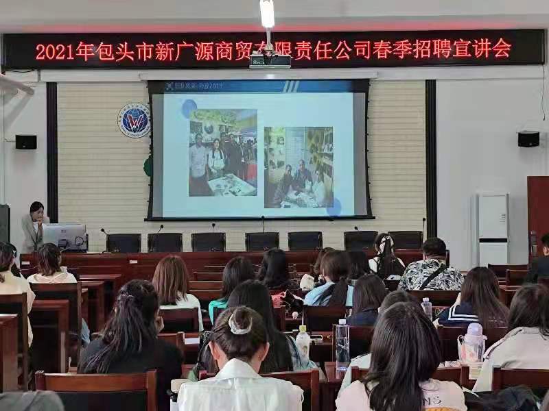 招聘会现场,包头市新广源商贸有限责任公司业务经理,公司2012级优秀毕业生王春颖详细介绍了关于我们。包头市新广源商贸有限责任公司成立于2013年,从事农副产品出口业务,是一家工贸一体的外贸企业。本次招聘会主要面向2017级商务英语专业和英语专业毕业生招聘外贸人才。