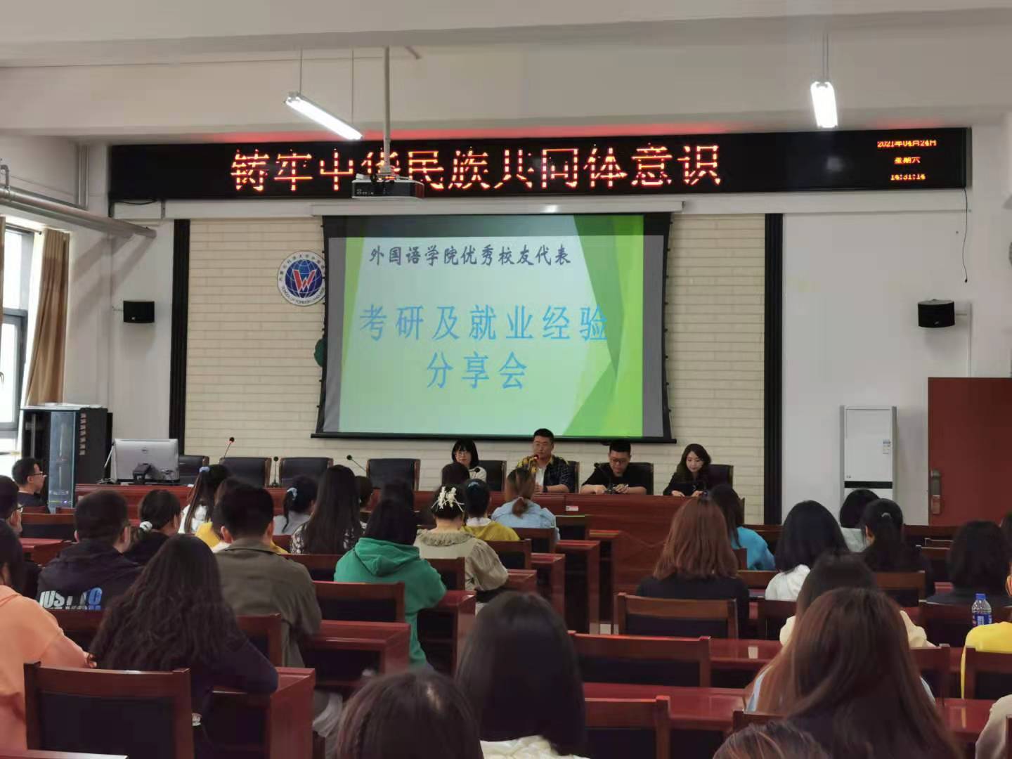 座谈会后,2019届员工戚新光、2020届员工史黎明、王晓宇和付天宇四位优秀员工在公司A205会议室为大三和大四两个年级的学弟学妹们分享了他们考研深造或者就业工作的经历和经验。